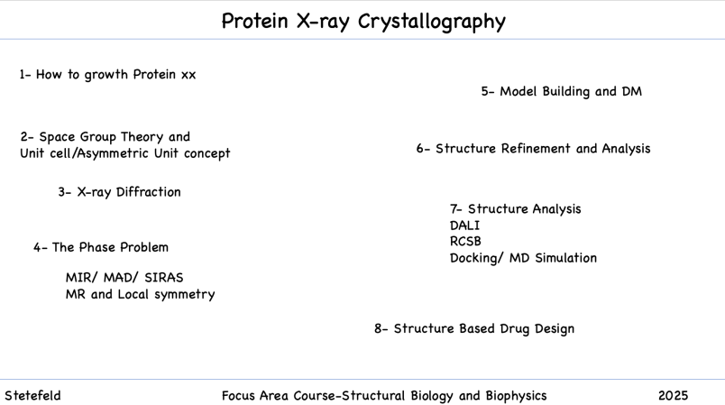 This course covers aspects from protein quality assessment over crystallisation to modern approaches in solving the phase problem and structural analysis.